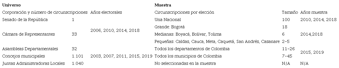 Considerando que lo anterior representa un amplio volumen de información y que existen limitaciones de tiempo y recursos, se decidió incluir en la muestra la totalidad de asambleas departamentales y concejos municipales en las contiendas de 2015 y 2019 . Se descartó así contar con información correspondiente a 2003, 2007, 2011 y los datos de juntas administradoras locales (jal). A nivel nacional se seleccionaron las tres últimas elecciones legislativas de la circunscripción nacional del Senado de la República y las dos últimas de una circunscripción grande, tres medianas y seis pequeñas de la Cámara de Representantes, las cuales proveen información correspondiente a 18 escaños por cada tamaño de circunscripción. Es de mencionar que Colombia cuenta con 33 circunscripciones en la Cámara baja, de las cuales tres pueden considerarse, según su tamaño (Nohlen, 1995), como grandes (más de 10 escaños), seis medianas (de 6 a 10) y 24 pequeñas (de 2 a 5).