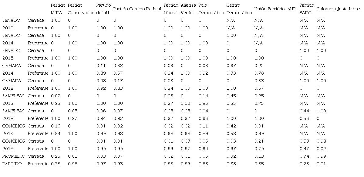 En segundo lugar, se refuerza la tendencia anteriormente señalada en relación con el peso del voto preferente y de algunas excepciones frente a la lista cerrada. Los promedios muestran cómo, en su orden, los partidos Conservador, Alianza Verde, Liberal, la U, Polo Democrático y Cambio Radical han presentado entre el 99 y el 93 % de sus listas con voto preferente, de tal forma que, en las tres elecciones nacionales estudiadas, todas las listas de Senado de estos partidos optaron por esta modalidad de voto. En contraste, las pocas listas cerradas presentadas por estas agrupaciones se concentraron principalmente en el nivel subnacional de la competencia (asambleas y concejos) y, excepcionalmente, en algunas circunscripciones de la Cámara de Representantes examinadas .