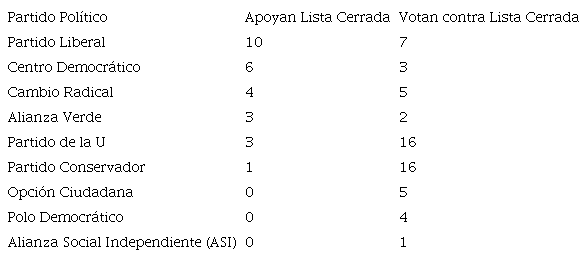 - Solamente el Polo Democrático y Opción Ciudadana votaron en bancada contra la lista cerrada, acompañados por la Alianza Social Independiente (ASI), otro partido minoritario en ese periodo. La votación de los senadores de todos los demás partidos se dividió en torno al tema.