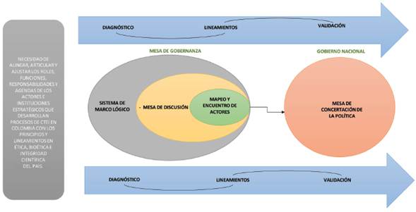 Desde la Mesa de Gobernanza se revisaron fuentes secundarias, como páginas web, documentos de la política, normas legislativas y memorias de los Diálogos Nacionales sobre Ética de la Investigación, lo que permitió realizar un diagnóstico inicial del sector que llevó a: i) identificar los aspectos básicos que direccionan la política, y ii) empezar con la identificación de los actores del sistema.