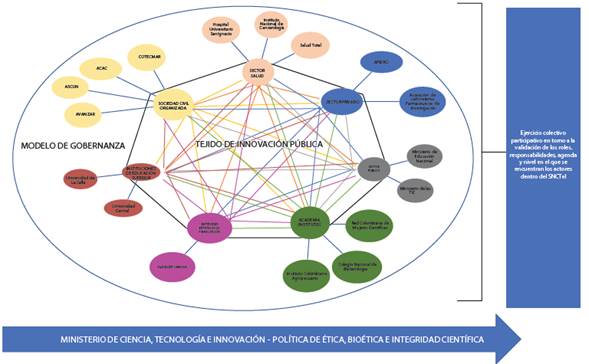 Gracias a este ejercicio de cocreación dado entre los diferentes stakeholders, se logró perfilar el mapa de actores en cuanto a roles y responsabilidades, de cara a la política de ética de la investigación, bioética e integridad científica; y, a su vez, clasificar los diferentes tipos de actores (visión de gobernanza) por niveles de influencia de acuerdo con su rol, funciones, nivel de compromiso y participación dentro del SNCTeI. Este ejercicio aún no ha finalizado, pues debe validarse sectorial y regionalmente con los diversos actores del sistema, actividad que se llevará a cabo el segundo semestre de 2020, en donde se definirán los roles y las responsabilidades finales.