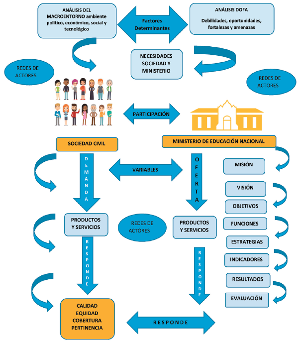 El estudio incorpora varios análisis del actual modelo de gestión y la declaración de las variables de planificación estratégica del Ministerio de Educación Nacional, así como la misión, la visión, los objetivos, productos y servicios, estrategias y estructura organizacional. Se complementa con el análisis DOFA y análisis del Macroambiente, ubicados en los anexos del proyecto de investigación.