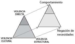Hay tres grandes grupos de violencia: la directa, la estructural y la cultural. La violencia directa se acaba con el cambio de los comporta mientos violentos, la violencia estructural con la eliminación de las contradicciones estructu rales y las injusticias, mientras que, la violencia cultural se acaba con el cambio de las actitudes. Estas formas para la terminación de la violen cia directa, estructural y cultural tienen una relación directa con los elementos teóricos centrales por valorar en el presente trabajo en tanto que la paz negativa se entiende como el cese de la violencia directa y la paz positiva como la superación de la violencia cultural y estructural (Galtung, 1990).