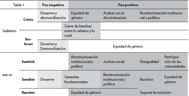 La tabla 2 sintetiza los elementos perte necientes a la paz positiva y negativa en cada una de las personas entrevistas, incluyendo elementos transversales. En las narrativas de la delegación del Gobierno nacional es evidente la importancia del desarme de las FARC para la paz, la presencia institucional, el cierre de bre chas entre habitantes rurales y habitantes urbanos, y una comprensión del conflicto desde una condición subjetiva bajo la cual, ante un cierre de espacios democráticos de participa ción, se armó la insurgencia alimentada por el fenómeno del narcotráfico en los territorios rurales y con cierto grado de legitimidad al haberse consolidado como administradora de normas de convivencia en tales territorios. Esto denota una orientación hacia reformas para la equiparación de los y las ciudadanas en todos los territorios, una reforma al sistema democrá tico y la eliminación de la violencia por parte de grupos armados al margen de la ley.