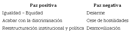 Para el caso de esta investigación, los rasgos de los dos conjuntos están descritos en los grupos de características que obedecen a la construc ción de una paz positiva y a la construcción de una paz negativa.