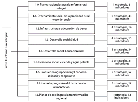 El punto 1 del Acuerdo Final busca sentar las bases para una transformación integral del campo colombiano, creando las condiciones de bienestar de los pobladores rurales y con tribuyendo a la construcción de la paz. La RRI, objeto de este punto, busca además integrar las regiones, cerrar las brechas, contribuir a erradicar la pobreza, promover la igualdad y asegurar el pleno disfrute de los derechos de la ciudadanía. Este punto está compuesto por nueve pilares que contribuyen a la definición de la política de ordenamiento social de la propie dad rural, la constitución del Fondo de Tierras, los procesos de formalización de baldíos y me canismos alternos de acceso, así como el desa rrollo en temas de salud, educación, vivienda, economía solidaria y alimentación (figura 1).