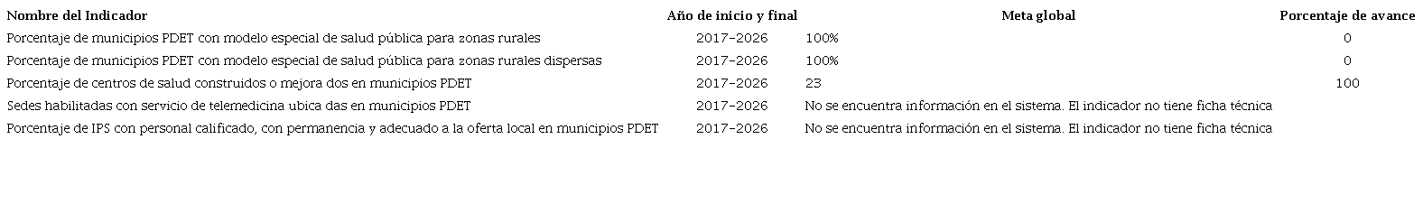 Como se muestra en la tabla 4, los indicadores relacionados con las sedes del servicio de tele medicina y con las IPS con personal calificado y una adecuada oferta local no cuentan con infor mación disponible sobre su implementación, aun cuando la fecha de inicio de estos indica dores era 2017. Esta situación afecta la atención extramural y dificulta superar las barreras de acceso efectivo a los servicios de salud de la po blación ubicada en territorios PDET (Ministerio de Salud y Protección Social, 2018).