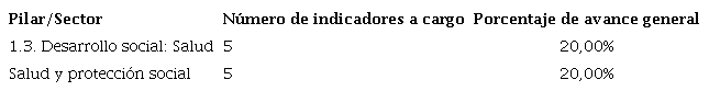 Frente a los sectores, se pudo establecer que los sectores de Vivienda y de Salud y Protección Social son los más rezagados, en contraste con Cultura, y Minas y Energía, que presentan mejores comportamientos. Respecto a los pilares, son los pilares 1.7. Ga rantía progresiva del derecho a la alimentación (67,64%) y 1.6. Producción agropecuaria y Economía solidaria y cooperativa (64,71%) los que cuentan con avances más relevantes en los compromisos asociados; mientras que el 1.5. Desarrollo social: vivienda y agua potable (17,88%) y 1.3. Desarrollo social: salud (20%) cuentan con los avances más bajos en materia de implementación.