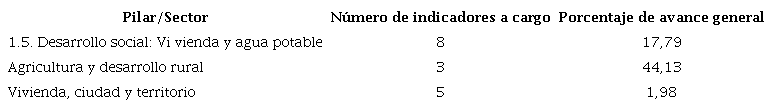 Es de resaltar que en este pilar se dividieron tres indicadores para que tanto el Ministerio de Vi vienda, Ciudad y Territorio como el Ministerio de Agricultura y Desarrollo Rural pudieran reportar avances en la implementación, pues, según el Plan Nacional de Desarrollo (PND) 2018-2022, "Pacto por Colombia, pacto por la Equidad", a partir del primero de enero de 2020 el Ministerio de Vivienda, Ciudad y Te rritorio (MVCT) tendrá a su cargo la formula ción y ejecución de la política de vivienda rural. Sin embargo, como se muestra en la tabla 8, los indicadores a cargo de este ministerio no pre sentan reporte de avance, aun cuando uno de sus indicadores, el relacionado con soluciones de vivienda estructuradas y ejecutadas con par ticipación comunitaria tiene establecida como fecha fin el año 2021. La entidad señaló que no se presentaron avances para estos indicadores pues previo a la estructuración y ejecución de soluciones de vivienda era necesario desarrollar las bases, lo cual se hizo durante 2020.