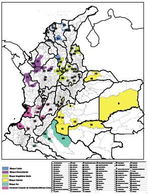 En efecto, el fortalecimiento militar de las FARC registrado desde de la Octava Conferencia de 1993, se expresaba en que la organización había ampliado sus frentes a 66 distribuidos en siete bloques por regiones: bloque Caribe; blo que Magdalena Medio; bloque Noroccidental o José María Córdoba; bloque Occidental; bloque Sur; bloque Central y bloque Oriental. Aun así, la actividad armada de estas estruc turas, que dependía de la disponibilidad de recursos económicos, el número de integrantes y la ubicación en el territorio, era bastante he terogénea (Echandía y Cabrera, 2017, p. 140).