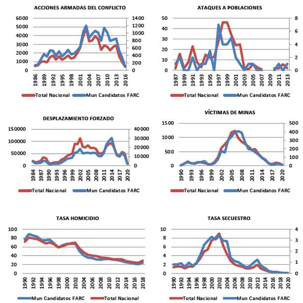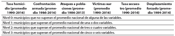 Tal como se muestra en la tabla 1, seis variables fueron tenidas en cuenta para establecer el nivel de intensidad del conflicto en los municipios que estuvieron bajo la influen cia de los bloques de las FARC en el pasado y donde el partido Farc presentó sus candidatos: 1) La tasa promedio de homicidio entre 1990 y 2016; 2) El promedio de las acciones de la con frontación armada entre 1986 y 2016; 3) Los ataques a poblaciones registrados entre 1986 y 2013; 4) El promedio de víctimas de MAP entre 1990 y 2016; 5) La tasa promedio de secuestro entre 1990 y 2016 y; 6) El promedio de personas desplazadas entre 1984 y 20164.