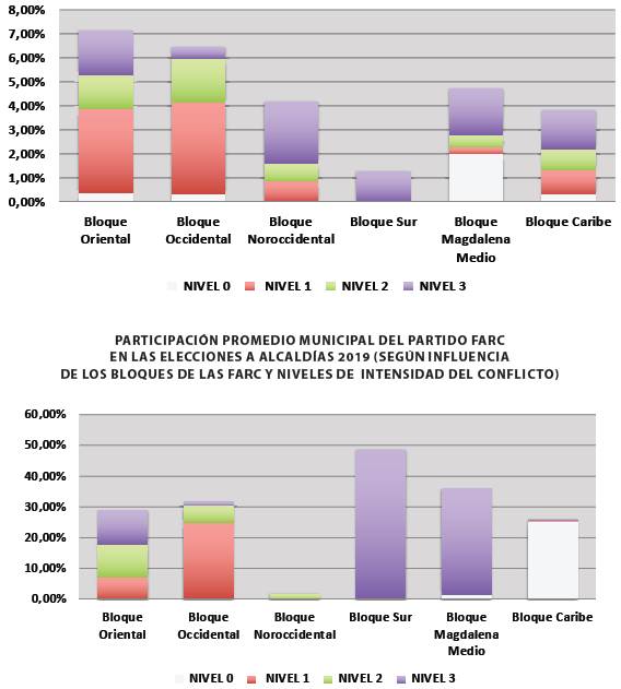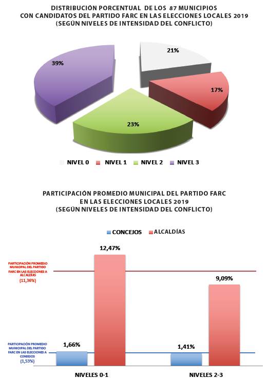 Es importante tener en cuenta que el partido Farc presentó candidatos a las alcal días de 21 municipios, con una participación promedio de 11,36 % y, al mismo tiempo, compitió por los concejos de 75 municipios, con una participación promedio de 1,53 %. En el primer conjunto de 21 municipios, donde el partido Farc aspiró a las alcaldías, cuatro se ubican en el nivel 0 de intensidad del conflicto, cinco en el nivel 1, cuatro en el nivel 2 y (8) en el nivel 3. En el segundo conjunto de 75 mu nicipios, donde el partido Farc compitió por los concejos, quince se ubican en el nivel 0 de intensidad del conflicto, doce en el nivel 1, die cinueve en el nivel 2 y veintinueve en el nivel 3.