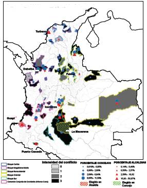En cuanto a la elección de alcaldes, el triunfo del partido Farc en los municipios de Guapi (Cauca) y Turbaco (Bolívar) se produce en escenarios que, ubicados en el área de acción de los bloques Occidental y Caribe respectiva mente, corresponden a los niveles más bajos de intensidad del conflicto. A diferencia de estos dos casos, en Puerto Caicedo (Putumayo), la elección de un desmovilizado de las FARC, que fue avalado por otro partido, se produce en la que fuera la zona de influencia del bloque Sur donde la intensidad del conflicto alcanzó el nivel más elevado.