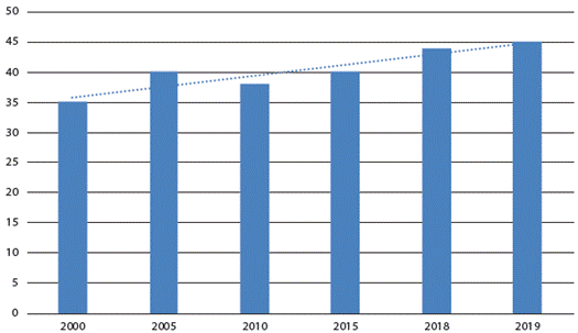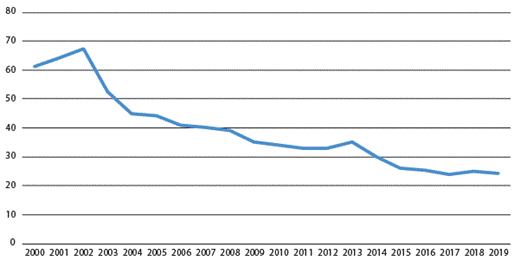 Más que nunca, parece evidente que las FARC-EP no eran el único actor de referencia en el fenómeno de la violencia. Paulatinamente se han ido reduciendo las muertes violentas por cada 100.000 habitantes, las cuales en 2002 eran 60 y en la actualidad apenas llegan a los 25 (figura 1). Sin embargo, la violencia homicida parece incrementarse exponencialmente, en más de un 100 % cuando se trata de escenarios de desmovilización de las FARC-EP o cuando concurre la presencia de cultivos cocaleros (Nussio, 2020). De esta manera, son otras estructuras criminales y grupos delincuenciales los que hoy resultan responsables de estas violencias del pos-Acuerdo de Paz, quienes operan como amenazas que durante la vigencia de las FARC-EP estuvieron relegadas a un segundo plano.