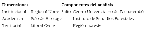 La investigación realiza un enfoque sociopolítico y neoinstitucional de las políticas definidas por el CDC, integra los debates sobre los cambios en la UdelaR y aplica esa mirada a los casos en dos territorios contrastantes. Este análisis nos permite explorar tres dimensiones del problema de investigación: a) una dimensión institucional, que tiene que ver con los contextos institucionales de las sedes universitarias donde se insertan los grupos académicos, llamados Polos de Desarrollo Universitario (PDU); b) una dimensión académica, que se refiere a la producción de estos grupos PDU, sus actividades, sus relaciones con otros académicos y los criterios y las motivaciones para establecer sus agendas; y c) una dimensión social que tiene que ver con la región en sí misma y la relación de los académicos con otros actores no universitarios.
