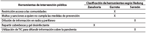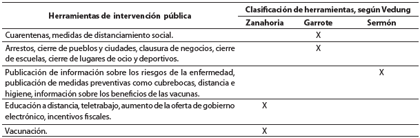 Hay que decir que las herramientas de política pública no son instrumentos que se apliquen de manera aislada unos de otros, algunos son fundamentales para la actuación de los gobiernos, como los instrumentos de autoridad que legitiman el proceso de políticas públicas y se relacionan también con las herramientas de garrote que implican una sanción o medidas que podrían considerarse impopulares o violatorias de las garantías constitucionales. Igualmente, las herramientas de información se vincularían con las de sermón, esto mediante la difusión de medidas de prevención de contagios, tratamiento de enfermos, desmentir noticias falsas, recopilación de estadísticas y lo referente a la vacunación. De igual forma, las herramientas de zanahoria se vinculan con las de tesoro, pues se utilizan recursos para la compra de insumos de prevención de contagios a fin de poder continuar con actividades como la economía y la educación.