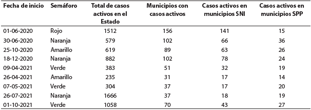 En Oaxaca, el desarrollo de la pandemia ha tenido el comportamiento según las olas epidémicas y el color del semáforo ha transitado por todos los niveles. Los cambios de los semáforos se realizan quincenalmente, a continuación, se presenta la tabla 3 con los principales movimientos de riesgo en Oaxaca y sus municipios.