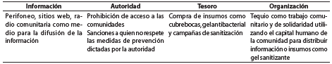 Como se mencionó, la gestión de la pandemia quedó mayormente en el ámbito federal, desde donde se dictaban las políticas por seguir, como el semáforo de riesgo epidemiológico, la suspensión o el permiso de actividades (apertura de restaurantes, bares, centros comerciales, gimnasios, estadios), la suspensión o el regreso a clases y la política nacional de vacunación. Los estados y municipios se ajustaban a lo marcado por las autoridades federales, pero municipios como los de SNI implementaron políticas públicas para contener la pandemia desde su perspectiva, sus facultades, capacidades y herramientas de política a su alcance, y también por la "llegada tardía e insuficiente de medidas estratégicas de prevención con información lingüística y culturalmente adecuada sobre el covid-19, la desconfianza hacia el sector salud y la falta de consulta a los pueblos indígenas en el diseño y la toma de decisiones sobre las medidas sanitarias" (Cortez et al., 2020, p. 9).