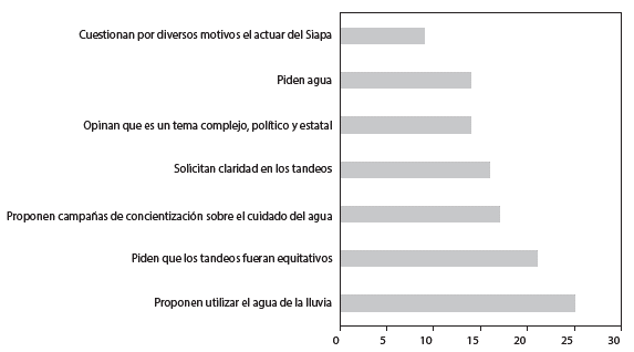 Asimismo, muchos de los encuestados solicitaron que la estrategia de los tandeos fuera equitativa. Al respecto, Briseño opina que "los usuarios que son víctimas de tandeos y baja calidad de agua, por lo general son de bajo poder político y económico" (2012, p. 15).