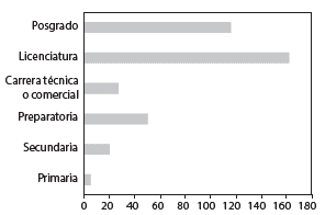 La mayoría de los encuestados tienen como último grado de estudios la licenciatura (162, 42,63 %); le sigue el posgrado (116, 30,53 %); la preparatoria (50, 13,16 %o); carrera técnica o comercial (27, 7,10 %); secundaria (20, 5,26 %); primaria (5, 1,32 %); y dos no contestaron (figura 2)
