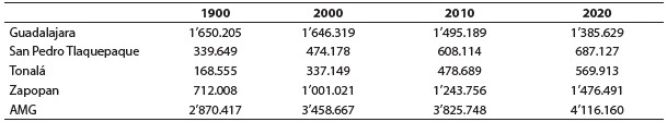 En la tabla 1 puede observarse de manera específica el crecimiento poblacional que ha registrado el AMG en el periodo que abarca de 1990 a 2020.