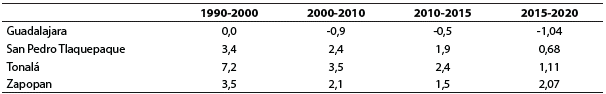 En la tabla 2 se ilustran las tasas de crecimiento poblacional, donde Guadalajara, el municipio central, registra números negativos.