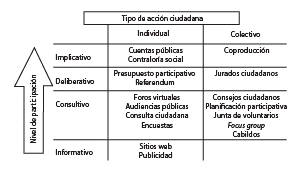 La participación ciudadana se puede analizar desde la tipología considerada por Ziccardi (1998) y Sánchez-Ramos (2009), quienes consideran cinco tipos: