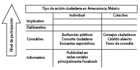 A manera de conclusión, la figura 4 resume la participación ciudadana del municipio objeto de estudio, la cual se limita a estar en los niveles informativo y consultivo, y no logra desarrollar los niveles deliberativo e implicativo, como se ilustró arriba. Entonces, la participación ciudadana del municipio encuentra varias áreas de oportunidad consistentes en desarrollar capacidades sustentadas en la convicción de la importancia que tiene la inclusión del ciudadano en la arena gubernamental y pública.
