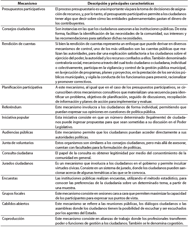 Los mecanismos de participación ciudadana mencionados en la tabla 1 dependen de la cuestión legal y de los mecanismos institucionales vigentes en cada país, por lo tanto, refieren a una participación institucionalizada.