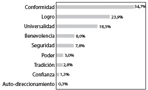 Una teoría de valores con estas características se describe en Schwartz y Bilsky (1987) y Schwartz (2012). De acuerdo con esta teoría, se pueden identificar diez "orientaciones básicas de valores humanos", definidos por metas particulares y agrupados en lo que llamaremos "dimensiones de valor": autodireccionamiento (pensamiento y acción independiente), estímulo (novedad y retos vitales), hedonismo (placer y satisfacción sensual), logro (éxito personal y demostración de competencia),poder (estatus, prestigio y control social), seguridad (seguridad, estabilidad y armonía), conformidad (restricción en beneficio de los demás, cumplimiento de normas), tradición (respeto por, compromiso con y aceptación de las costumbres tradicionales), benevolencia (preservar y aumentar el bienestar de las personas con las que se tiene contacto directo frecuente) y universalidad (protección del bienestar de todas las personas y de la naturaleza).