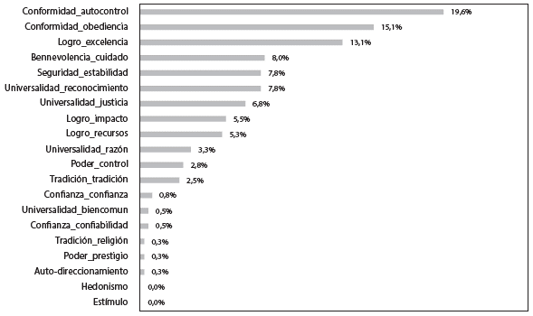 Un análisis más detallado de las frecuencias relativas de las subcategorías muestra otros hallazgos interesantes. Al final de la figura 2 se puede apreciar que la dimensión hedonismo no aparece en el código, lo que es consistente con la naturaleza de la entidad. Es igualmente notable que la dimensión estímulo tampoco tiene valores asociados. Desde un punto de vista de estrategia organizacional, implicaría que la entidad no considera éticamente relevante crear estímulos para sus servidores en el ejercicio de sus funciones, o que sus servidores encuentren estimulante su trabajo en la entidad. Este hallazgo, junto con el hecho de que conformidad_autocontrol y conformidad_obediencia son las categorías con mayor incidencia, implica un sesgo del código a favor de la conformidad y en contra de la iniciativa propia de los servidores. Este hallazgo indica con gran claridad que el código de ética de la FGN pertenece a los códigos que enfatizan la regulación externa de los servidores por medio de obligaciones y prohibiciones, así como el énfasis en la realización adecuada, en sentido técnico, de las tareas asignadas (logro_excelencia).