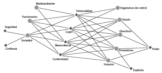 Como se puede apreciar, el código de ética diferencia los retos éticos de acuerdo con los grupos de interés, ya que no todos los grupos están relacionados con todas las dimensiones de valor. Igualmente, es notable que algunas dimensiones son más centrales que otras por tener conexiones con más grupos. Estas son logro, conformidad, universalidad y benevolencia. En este sentido, se puede afirmar que estas dimensiones forman el "núcleo ético" de la entidad, tanto por análisis de frecuencia como por análisis de los grupos de interés.