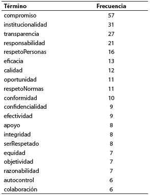 La tabla 1 genera más inquietudes de las que resuelve. Primero, es de notar que la frecuencia del primer término en la lista, "compromiso", es casi el doble de la frecuencia del segundo término, "institucionalidad". En general, se puede afirmar que la frecuencia disminuye rápidamente en los primeros puestos y más lentamente después. ¿Esto significa que el código tiene sesgos morales a favor de estos valores altamente frecuentes, o es simplemente el efecto de la ley de Zipf sobre la distribución de frecuencias de palabras en un texto? (Yang, 2013; Lestrade, 2017). Segundo, teniendo en cuenta que el análisis arroja un número considerable de términos distintos que denotan valores (69 en total), 21 de los cuales tienen una sola mención y 8 solo dos menciones, la siguiente pregunta es: ¿de qué manera contribuyen estos términos "solitarios" a la estructura ética del código? Tercero, dado el alto número de valores distintos en el código, no es claro qué signifique, en términos de su estructura de valores, que aquellos como por ejemplo "oportunidad" (en el sentido de la realización de tareas en el tiempo previsto) y "respetoNormas" tengan cada una once menciones, mientras que "celeridad" y "honestidad" tengan cada una solo dos menciones. ¿"Oportunidad" y "celeridad", y, respectivamente, "respetoNor-mas" y "honestidad" son tan marcadamente disímiles en importancia, aunque parecen ser, en términos sustantivos, compatibles y relacionados?