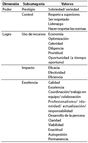 Las siguientes dos dimensiones, universalidad y benevolencia, contienen valores relacionados con la función de la entidad tales como "justicia", "imparcialidad", "objetividad", "respetoPersonas", "confidencialidad" y "cui-dadoPersonas". Tienen una participación en el código del 18 y 8%, respectivamente, para un consolidado del 26% (apenas una cuarta parte de las menciones). Esto es notable ya que, desde un punto de vista estratégico, los valores relacionados con la función de la entidad deberían jugar un rol sobresaliente, mientras que los valores relacionados con el funcionamiento de la organización como burocracia deberían jugar un rol menos prominente.