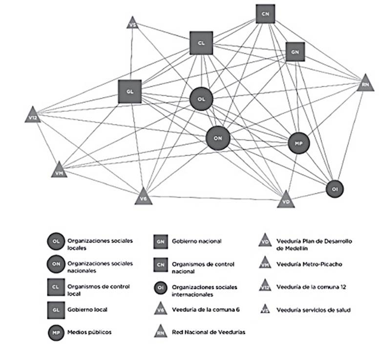 Además, ello permite evaluar una hipótesis: en contextos con características de competencia y pluralidad política, las veedurías ganan capacidad de expansión a través de redes de interacción de actores predominantemente locales, mientras en entornos de competencia estrecha, la activación y el sostenimiento del control societal depende de redes con más predominio de actores extralocales.