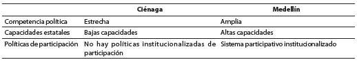 Si en Medellín los actores más fortalecidos tenderían a ser organizaciones sociales mientras en Ciénaga se trata del gobierno, ello se debe a las diferencias en el contexto político. Todo ello tiene que ver con las relaciones políticas como recurso, pues al ser menor el número de fuerzas de oposición, la interlocución directa con quienes gobiernan puede ser más viable que las alianzas con actores de otros partidos.