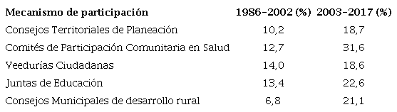 Si en los cortes temporales expuestos se relacionan cambios institucionales e incremento en el número de veedurías registradas, ¿esta cifra no será producto de la mejora de procesos administrativos? Aunque no se puede descartar, esta esfera de influencia más bien tiene que ver con la actividad de funcionarios pertenecientes a las redes departamentales para promover el control societal. Además, en estos años parece existir un cambio en el clima participativo, pues de acuerdo con dos encuestas realizadas por Foro Nacional por Colombia, entre 2002 y 2018 hay un incremento de la participación declarada a través de diferentes mecanismos participativos, entre ellos, las veedurías ciudadanas (Velásquez et al., 2020, p. 155) (tabla 1).