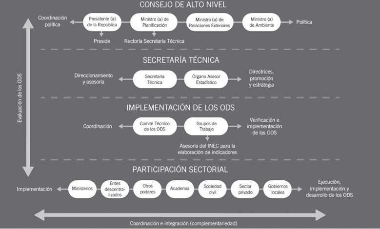 No obstante, y a pesar de que para la implementación de los ODS resultará imprescindible la participación clara y consciente de diferentes actores públicos, privados, ciudadanos y habitantes del país, tal y como se muestra en la figura 1, en la Gobernanza de los Objetivos de Desarrollo Sostenible, estructurada por el Ministerio de Planificación Nacional y Política Económica (Mideplan, 2017), no se incluye a las ADC como enlace y partícipes indispensables en todo ese accionar.