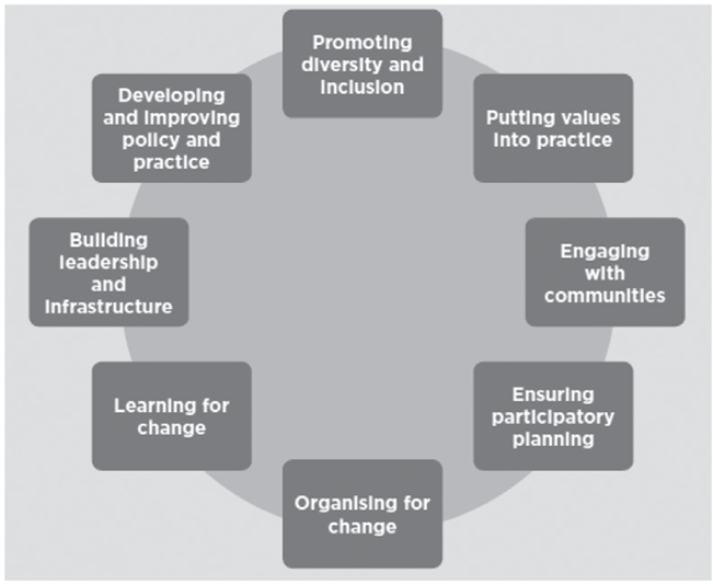 El desarrollo comunal es una práctica profesional y una disciplina académica que promueve la democracia participativa, el desarrollo sostenible, los derechos, las oportunidades económicas, la equidad y la justicia social, a través de la organización, la educación y el empoderamiento ciudadano con sus comunidades, sea de localidad, interés o identidad, en espacios urbanos o rurales. (2018, p. 8)