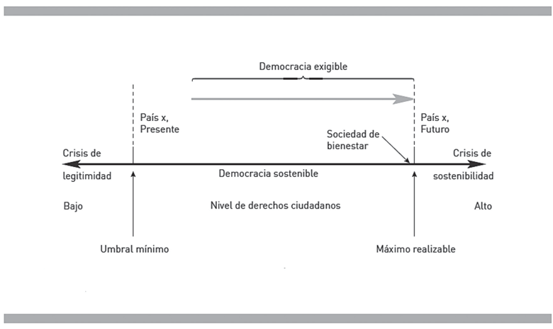 Ahora bien, considerando que la democracia no es una condición estática, sino que debe ser ejercitada a fin de fortalecerla tanto por la ciudadanía en general como por el aparato estatal y todos los poderes (ejecutivo, legislativo y judicial) e instituciones que lo conforman, el PNUD y la Organización de los Estados Americanos (OEA) se refieren a la democracia sostenible (PNUD/OEA, 2010, p. 47), tomando como base los derechos ciudadanos y la búsqueda del bienestar colectivo, lo que pudiere incluso graficarse según el nivel al-canzable y que, desde nuestra perspectiva, debe ligarse con las mejores condiciones comunales en materias como: salud, educación, seguridad, resguardo ambiental, acceso al empleo, por citar solo algunas (figura 3).
