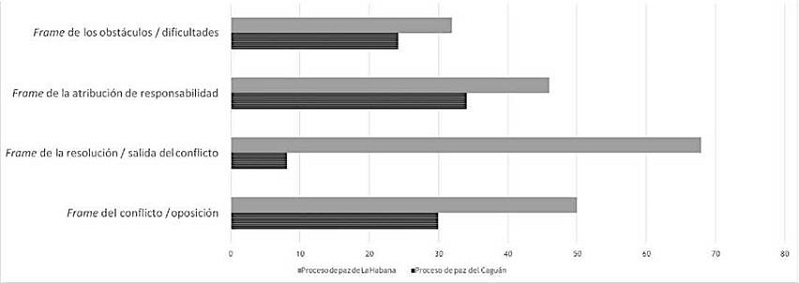 En segundo lugar, la identificación de la frecuencia de aparición de los frames en la muestra escogida permite hacer un análisis contrastado de la forma en que la revista encuadró su narrativa sobre ambos procesos, motivando una lectura orientada de los acontecimientos que tuvieron lugar en el marco de las negociaciones. La figura 1 ilustra este contraste.