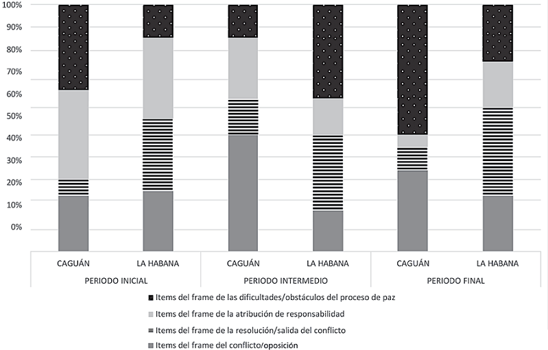 Si bien es posible realizar un análisis comparativo entre los dos procesos gracias al uso los mismos encuadres, observamos que el frame de la salida del conflicto predomina para cubrir las negociaciones de La Habana, mientras que el del conflicto domina la cobertura mediática del Caguán. Esta preferencia resulta lógica, dado que los diálogos de paz de La Habana fueron exitosos y condujeron al cubrimiento de la resolución y salida del conflicto, mientras que los del Caguán fracasaron y en el cubrimiento mediático se puso el acento sobre el antagonismo entre los actores que imposibilitaron la resolución del conflicto y sobre la responsabilidad de estos en la derrota. Esta tendencia explica también la frecuencia del frame de atribución de responsabilidad. Sin embargo, los frames de los obstáculos, muy presentes para el cubrimiento del Caguán y de La Habana, revelan que ambos procesos fueron difíciles, con muchos obstáculos y dificultades por superar, y con enfrentamientos entre los actores en las mesas de negociación, pero también en los territorios.
