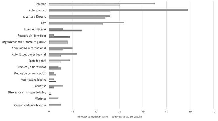 La revisión de las fuentes citadas en los textos periodísticos analizados es importante en la medida en que el acceso al medio, definido por Yoon (2005) como un "estado de rutina", es funcional para los actores que compiten por el control de los encuadres noticiosos, pues sirven como estrategias para la construcción retórica de la realidad al reforzar los criterios de veracidad y credibilidad de la información (van Leeuwen, 2007; Hánggli, 2012). En la figura 3 se puede comprobar una misma jerarquización de las fuentes principales para ambos procesos de paz, si bien cambia el orden, se mantiene la preferencia por las fuentes consideradas de alto valor informativo: los actores de la noticia (gobierno y FARC-EP), los actores legitimados por su conocimiento (analistas/expertos) y aquellos que dotan de emocionalidad al relato (actor político). En ambos casos, el actor político ocupa un lugar privilegiado, esto se debe tanto a su estatus dentro del orden institucional que le concede un carácter de permanente interés periodístico, como al rol que cumple dentro del apalancamiento de los diálogos y de su posible implementación. Finalmente, de la figura 3 también se puede deducir la centralización en la cobertura de los procesos de paz, siendo evidente en el poco protagonismo o ausencia de voces relacionadas con los territorios aun cuando son los más afectados por el conflicto. Se evidencia aquí el compromiso político de Semana con las élites dirigentes del proceso de paz, mas no con otros tipos de actores que podrían aportar, desde el margen, su experticia sobre el tema de paz por su experiencia empírica en el conflicto.
