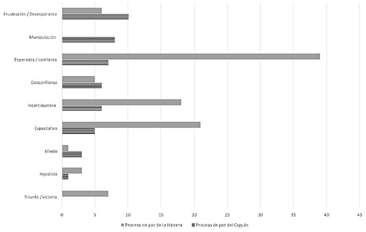 Si observamos los valores asociados a la cobertura del Caguán y La Habana respectivamente, encontraremos dos estados de ánimo opuestos. En el caso del Caguán, los valores que más suman son los negativos como "frustración/desesperanza", "desconfianza" y "miedo". En cuanto al valor "manipulación", solo existe para este proceso, y está estrechamente relacionado con el actuar de las FARC representadas como una guerrilla fortalecida militarmente frente a un gobierno débil sobre el cual ejercían constante presión: "Todo indica que la agenda del proceso de paz con ese grupo sigue siendo manejada por Marulanda y sus hombres", señalaba la revista el 3 de mayo de 1999; mientras que, en el segundo proceso de paz, se las mostró como una guerrilla debilitada militarmente al tiempo que se destacaba la capacidad estratégica del gobierno. De allí que el valor de "manipulación" esté asociado únicamente a las negociaciones del Caguán. En cuanto a La Habana, aunque aparecen valores negativos como "incertidumbre" o "injusticia", los valores que predominan en el cubrimiento son los de "confianza/esperanza", "expectativa", "triunfo/victoria". Este último está relacionado con un elemento particular del contexto en el que se desarrolló este proceso: el enfrentamiento Santos-Uribe. "Con estos dos problemas resueltos -justicia y verificación de la dejación de armas- Santos le ganó a Uribe el pulso de la paz" (Semana, 31 de enero de 2016).
