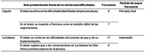 En ambos procesos, el ítem predominante del frame de los obstáculos/dificultades enfatiza en los problemas y las fallas del proceso, la diferencia es que, en el Caguán, la revista privilegió este frame de manera temprana. La noticia de las negociaciones fue abordada desde el punto de vista de los obstáculos que conllevaba y de las relaciones de fuerza entre gobierno y guerrilla. El énfasis en la debilidad de Pastrana frente a unas FARC-EP unidas y sin voluntad de paz contribuyó a alimentar el escepticismo en el proceso. En cuanto a La Habana, uno de los ítems más recurrentes de este frame es el que reclama mayores avances en la negociación, un enunciado que tuvo origen en el discurso oficial y se instauró en la narrativa del medio. De acuerdo con el gobierno, el proceso duraría "meses y no años" (Semana, 16 de noviembre de 2012); pese a que esta sentencia no se cumplió, el proceso estuvo siempre atado a una fecha límite: el mandato presidencial de Juan Manuel Santos.