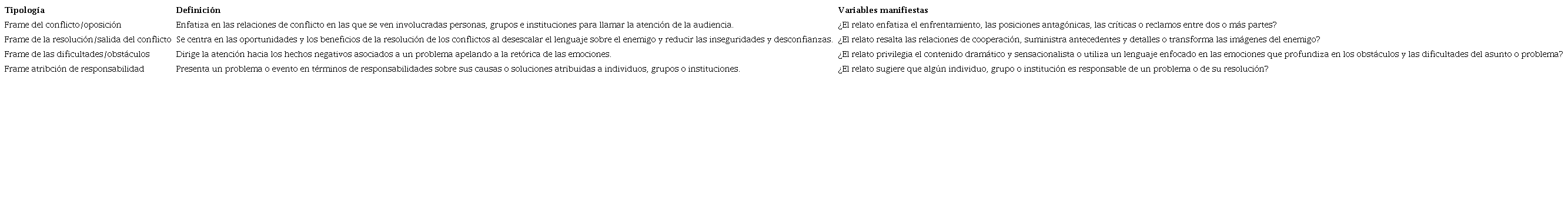 Por fin, conviene señalar que los frames no están per se en los hechos, sino en la forma en que los periodistas los ordenan y representan (van Gorp, 2007). Siguiendo a Entman (1993; 2007), los frames ofrecen argumentos que estimulan a la audiencia a pensar, evaluar y actuar de una determinada manera y pueden encontrarse en el texto (por la presencia o ausencia de ciertos elementos del lenguaje); en el comunicador (que de manera consciente o inconsciente elige qué decir); en el receptor (que hace una determinada interpretación), y en la cultura (que almacena marcos de interpretación comunes).