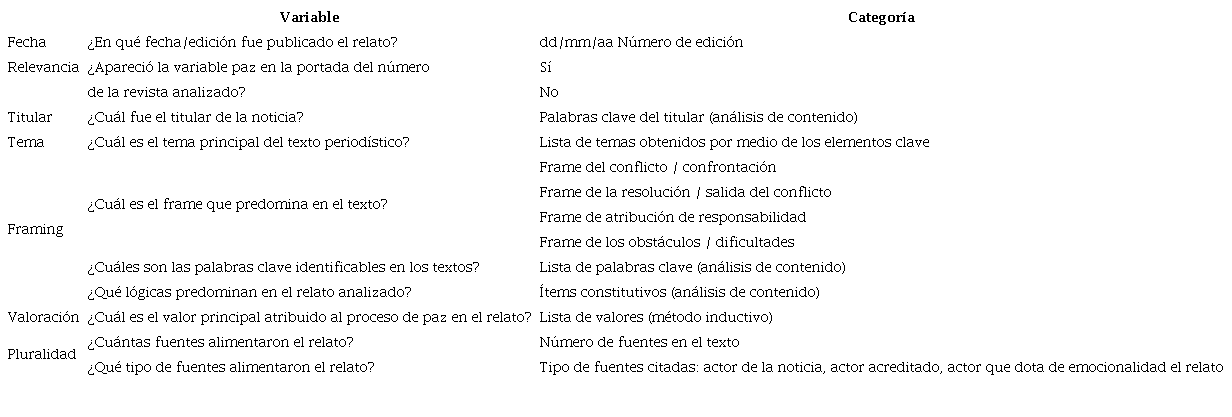 Dado lo anterior, en el presente estudio se ha adoptado una aproximación deductiva en la definición de los encuadres que sirvieron como variables analíticas para el estudio de la evolución del framing de la revista a lo largo de dos procesos de paz, y una aproximación inductiva para la identificación de los elementos constitutivos de cada frame desde el análisis de contenido.