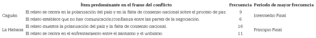 Wolfsfeld (2001) señala la falta de consenso entre las élites políticas alrededor de la paz como el principal factor de influencia para que los medios mantengan la narrativa del conflicto. En los procesos de paz del Caguán y La Habana esta falta de consenso, tanto de la opinión pública como del establecimiento, sobre la paz o la forma de llegar a ella, dio lugar a una cobertura centrada en la polarización y la búsqueda de opuestos ideológicos en 1 de cada 3 noticias que se enfocaba en el conflicto. Si bien en el Caguán la tensión giró en torno a las diferencias entre militares-gobierno y gobierno-guerrilla, en La Habana se concentra en el enfrentamiento entre Santos y Uribe, quienes se convierten en los principales actores en conflicto por encima de los actores históricos de la negociación (tabla 4).