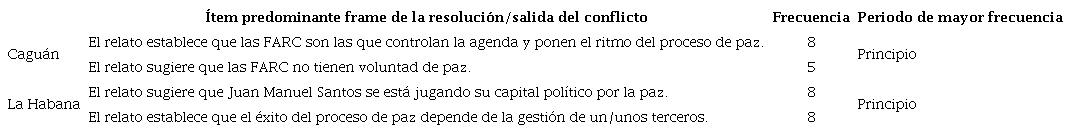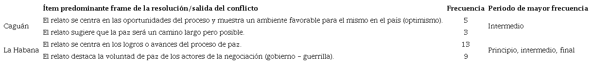 Aunque el frame de resolución/salida del conflicto es el menos utilizado en la narrativa del proceso de paz del Caguán -en parte por el desgaste de las negociaciones y la ruptura final que dio lugar a una intensificación del conflicto, pero también por la posición escéptica, tendente a la atribución de responsabilidades y a la profundización de la narrativa del adversario que asumió el medio desde sus inicios-, este no estuvo totalmente ausente. El ítem con mayor presencia en este frame señala el ambiente favorable que había en el país para la búsqueda de la paz, algo que puede contrastarse con la situación política de ese entonces, en la que múltiples actores -políticos, empresarios, académicos- buscaron figurar en el proceso.