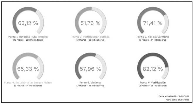 A contracorriente de la anterior lectura sobre la implementación del AFP, las cifras de cumplimiento del Acuerdo mostradas por el gobierno nacional hasta el 30 de junio de 2022 son sumamente positivas, la reforma rural integral en un 63,1%, la participación política en un 51,76%, el fin del conflicto en un 71,41%, la solución al problema de las drogas en un 65,33%, la atención a víctimas en un 57,9% y la verificación del AFP en un 82,1% (SIIPO, 2022) (figura 2). Los anteriores datos son la base empírica utilizada por el expresidente Iván Duque para respaldar su idea de haber estado comprometido con la legalidad, la reducción de los cultivos ilícitos y la garantía plena al proceso de reincorporación de excombatientes de las FARC-EP (Ríos y Morales, 2022).